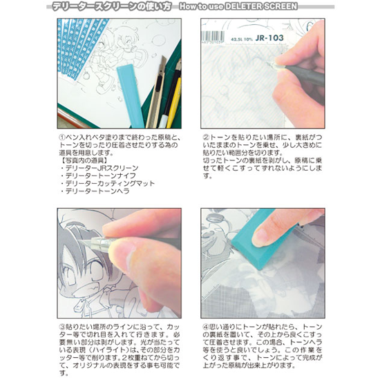 2枚以上重ねてオリジナルパターンを創ったり、ナイフなどで削ってハイライト部を表現したり、ちょっとしたイラストから本格的なコミックまで様々な表現が自由自在に出来ます。